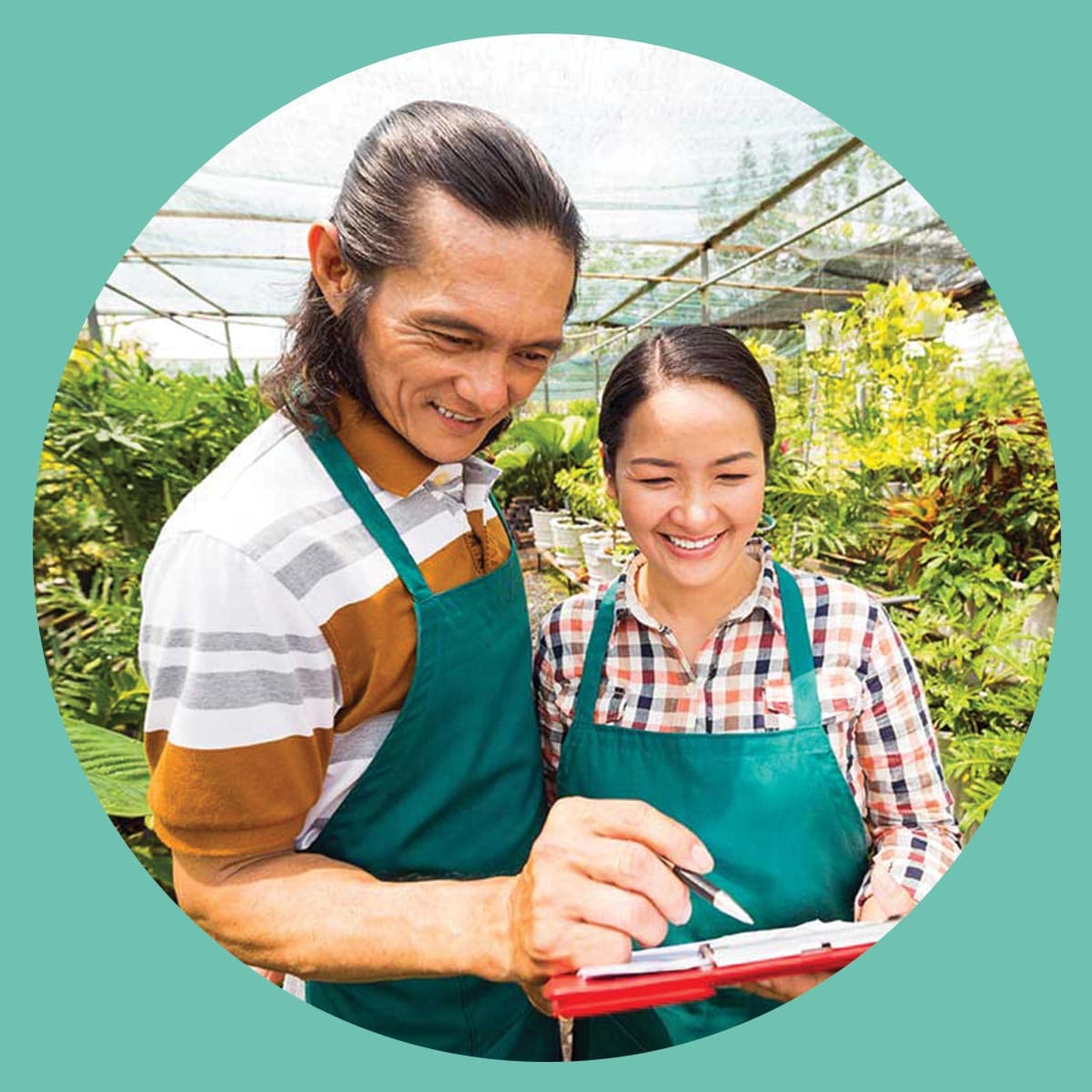 Look at a photo of a man and a woman looking at a book inside a greenhouse. What is the story behind this photo? Let your students decide!