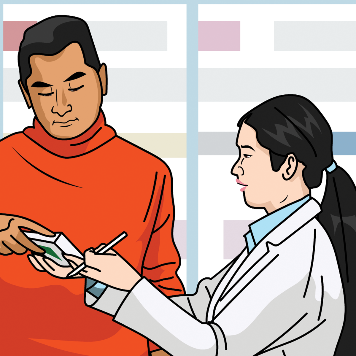In this unit, a customer inquires about over-the-counter medications. A pharmacist is called over to help with questions about using a treatment for children.