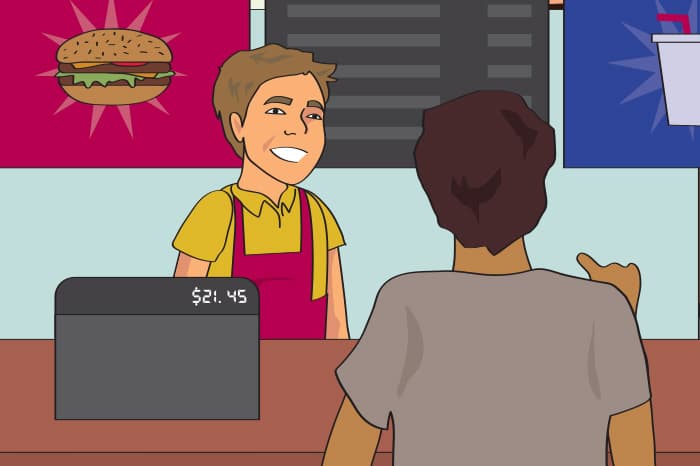 A customer orders food at a fast-food restaurant. The cashier asks the customer a variety of questions. Students learn vocabulary and expressions to use when ordering food in a fast-food restaurant.